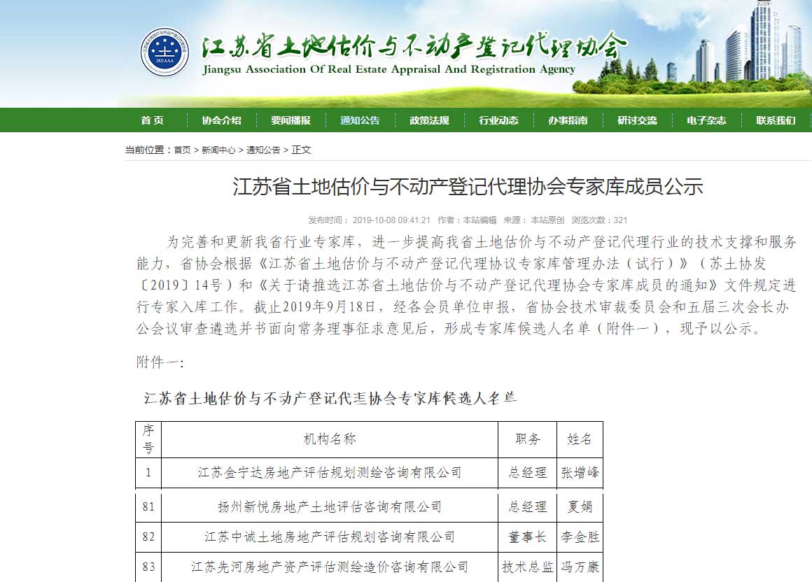 為完善和更新省行業(yè)專家?guī)?,省協(xié)會根據(jù)《江蘇省土地估價與不動產(chǎn)登記代理協(xié)議專家?guī)旃芾磙k法(試行)》(蘇土協(xié)發(fā)〔2019〕14號)和《關(guān)于請推選江蘇省土地估價與不動產(chǎn)登記代理協(xié)會專家?guī)斐蓡T的通知》文件規(guī)定進行專家入庫工作。我公司董事長李金勝入選江蘇省土地估價與不動產(chǎn)登記代理協(xié)會專家?guī)斐蓡T。